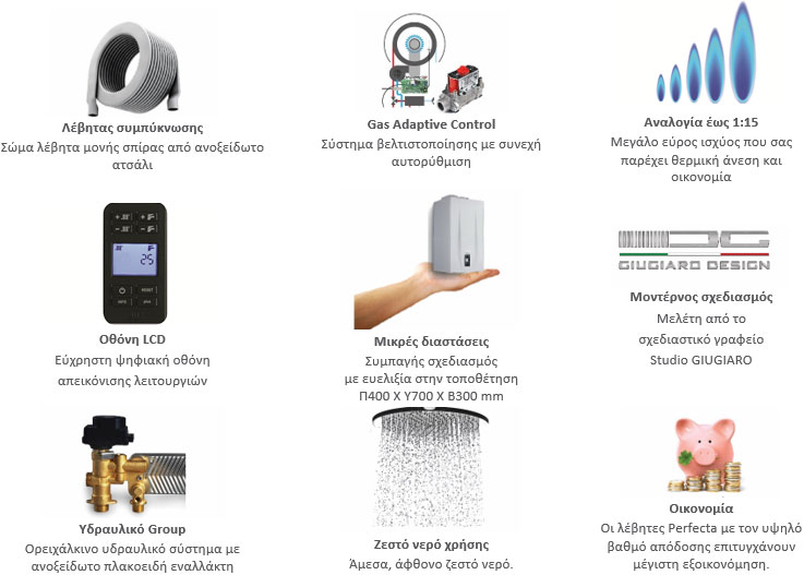 Ενώ στους παραδοσιακούς λέβητες οι τιµές καύσης επαληθεύονται µόνο κατά τη διάρκεια της συντήρησης, οι νέοι λέβητες Perfecta διορθώνουν συνεχώς την καύση διατηρώντας σταθερή την ποιότητα της, αύξανοντας την διάρκεια ζωής του συστήµατος, µειώνοντας την κατανάλωση καυσίµου προς όφελος δικό σας αλλα και του περιβάλλοντος.