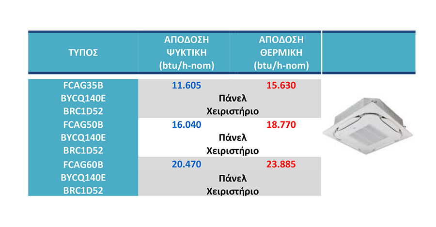 Γρήγορη προβολή Quick View Daikin FFA60A Εσωτερική Μονάδα multi Κασέτα Τεσσάρων Κατευθύνσεων 20.000 btu 1.158,00 € Προσθήκη στο καλάθι