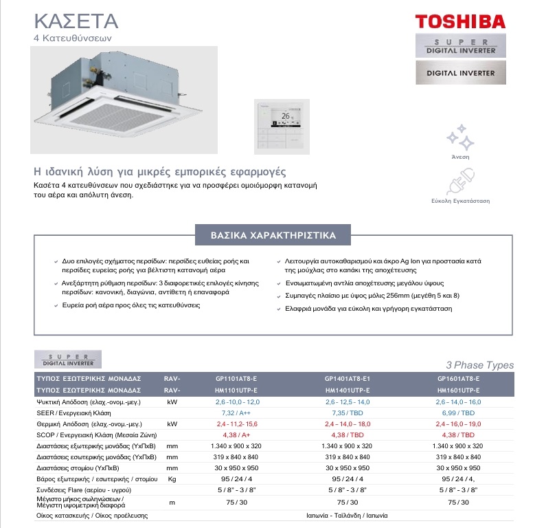 Γρήγορη προβολή Quick View Toyotomi CCT42IUINVR32 / OU423INVR32 Τριφασική Κασέτα Inverter R32 42.000 btu 3.079,00 € 2 Χρόνια Εγγύηση για όλα τα μέρη και 5 χρόνια για τον συμπιεστή Προσθήκη στο καλάθι
