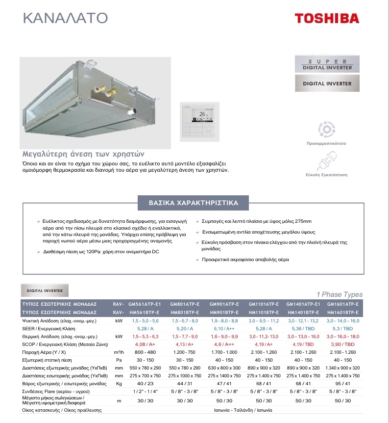 TOSHIBA RAV-GM301ATP-E / RM301SDT-E Καναλάτο μονοφασικό 9.000 btu/h