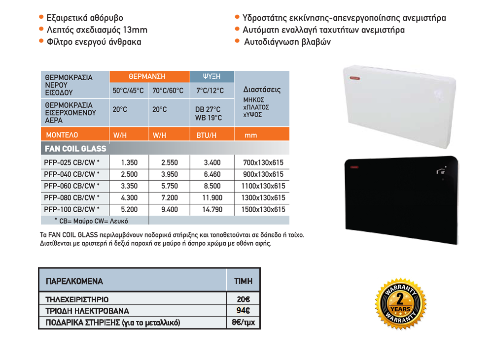 PHNIX PFP-060V-CW Fan Coil Glass νερού ψύξης-θέρμανσης 2,50kw-5,75kw με Άσπρο Τζάμι