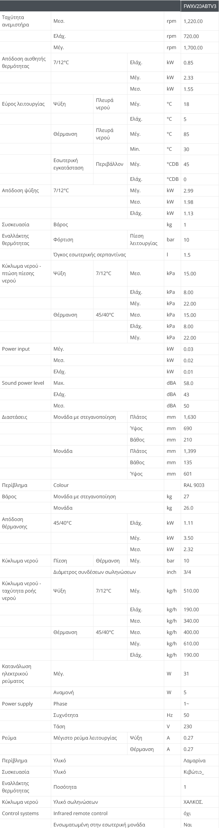 -Πίνακας προδιαγραφών για FWXV-ATV3